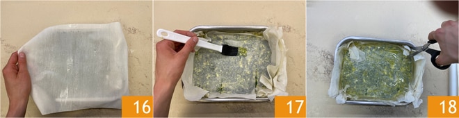 Add another layer of phyllo dough 13 brushed with oil 14, then proceed in the same way to make 2 more layers, for a total of 4. At this point, pour the filling 15 and distribute it well throughout the pan.