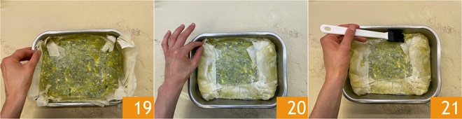 You can then proceed to fold the corners inwards 19 so that the filling does not spill out 20, then brush again with oil 21.