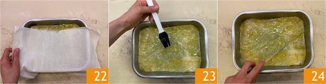 Add a final sheet of phyllo dough to cover everything 22 and brush one last time with oil 23. Make diagonal cuts across the entire surface 24.