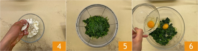 In the meantime, crumble the feta by hand 4. Once cooked, drain the spinach well 5 and transfer them to a sieve, then press them to remove excess water. Pour the spinach into a bowl and add the eggs 6.