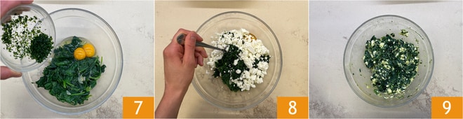 Add the chopped parsley as well 7, the crumbled feta, and mix everything together 8. If you prefer, you can chop the spinach to get a more homogeneous mixture 9.