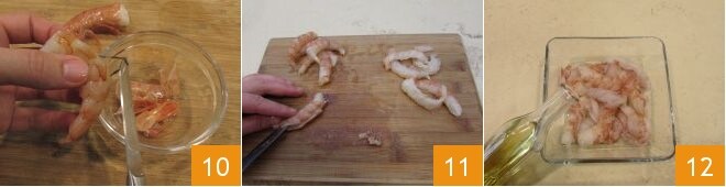 then extract with a knife the gut, the black filament located on the back 10. Once cleaned, obtaining 8.8 oz of shrimp, cut them in half lengthwise 11 and place them in a bowl, season with half the olive oil 12