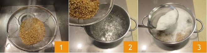 To prepare the spelt and shrimp salad, start by preparing the pearled spelt: rinse it under running water 1 to remove any impurities, then pour it into plenty of boiling salted water 2 and cook the pearled spelt for about 15 minutes or according to the instructions on the package, taking care to remove with a skimmer the impurities foam that forms on the surface during cooking 3.