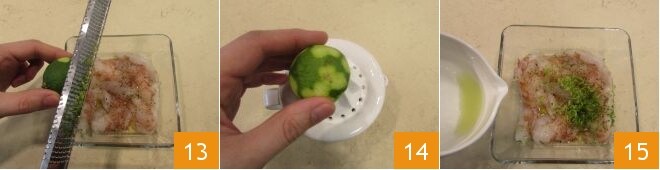 flavor with grated lime zest 13, then squeeze and pour half the lime juice onto the shrimp 14 15,