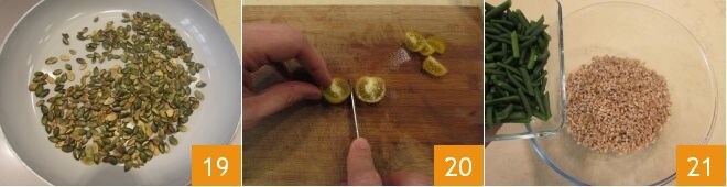 Now toast the pumpkin seeds in another hot skillet for about 2 minutes, being careful not to burn them 19; then turn off the heat and let them cool. Finally, wash the yellow cherry tomatoes and cut them into quarters 20. Everything is ready to assemble the spelt and shrimp salad: in a large bowl, pour the cooked and now cold spelt, add the green beans 21,