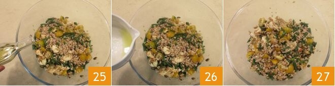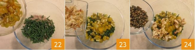 the yellow cherry tomatoes 22, the sautéed shrimp 23, and finally, the toasted pumpkin seeds 24