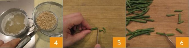 Drain the spelt in a fine-mesh strainer, preserving the cooking water 4. Let the spelt cool, then wash the green beans, trim them 5 and cut them into pieces about 0.75 inches 6.