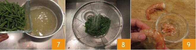 Boil the green beans for 7/8 minutes in the same water used to cook the spelt 7, once cooked, drain them and let them cool under running water 8. Now take care of the shrimp: remove the legs and the shell, the covering that encloses the shrimp 9 (you will obtain 8.8 oz of cleaned tails)