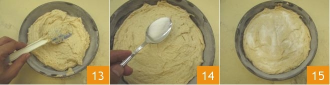 Level the batter in the pan with the help of a spatula 13 and then dust the surface with a tablespoon of sugar (14-15).