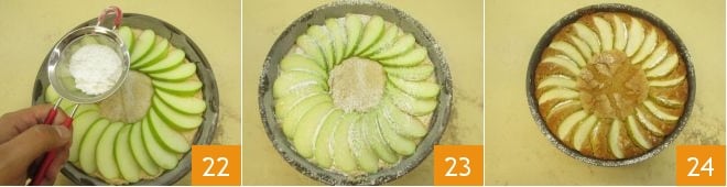 Arrange the apple wedges on the surface of the cake, slightly overlapping them (19-20) and forming a circle, leaving the center of the cake empty 21.