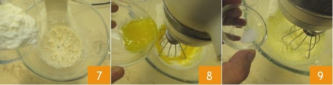 Also add the Greek yogurt 7 and continue working until you have obtained a frothy mixture. At that point, add the room temperature eggs 8 and, continuing to mix, also add the salt 9.
