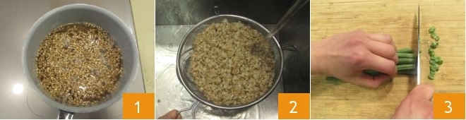 To prepare spelt balls with ricotta and vegetables, first boil the spelt for about 10 minutes 1. After the cooking time, drain the spelt and quickly rinse it under cold water 2, then pour it into a large bowl that you will temporarily set aside. Proceed to prepare the vegetables: wash the green beans, trim the ends and cut them into slices 3,