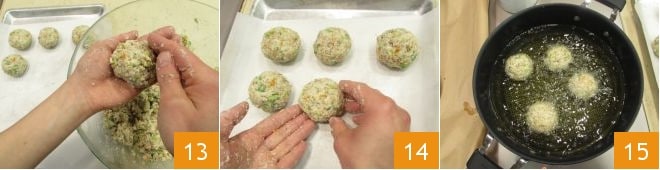 Mix all the ingredients well and with the obtained mixture form balls weighing about 2 oz each 13. Flatten them slightly with your hands and place them on a tray as you shape them: you will get 20 with these quantities 14. Meanwhile, heat the vegetable oil in a saucepan until it reaches a temperature of 340°F (you can check the temperature with a kitchen thermometer). Fry a few meatballs at a time 15, turning them on both sides, for a total time of about 5 minutes.