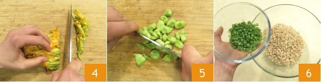 then gently clean the zucchini flowers, remove the inner stem and chop them with a knife 4; finally coarsely chop the already shelled fava beans 5. Take the bowl with the spelt and add the green beans 6,