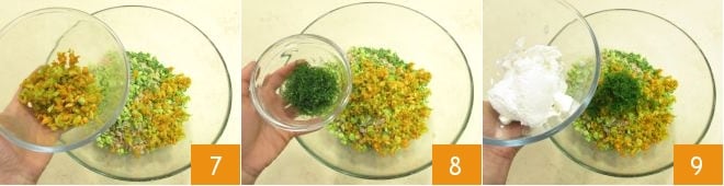 the fava beans, the zucchini flowers 7, the fennel which you have previously chopped 8, the ricotta 9,
