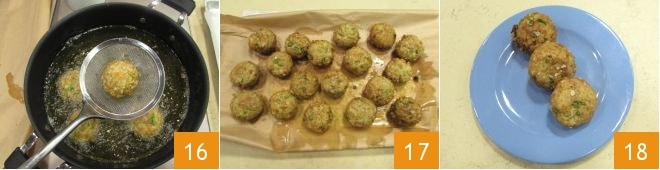 When the meatballs are evenly golden, remove them from the oil with a slotted spoon 16 and let them drain on a sheet of paper for frying 17. Continue with all the others, then sprinkle with a bit of coarse salt (or Maldon salt). Your spelt balls with ricotta and vegetables are ready to be served hot 18!