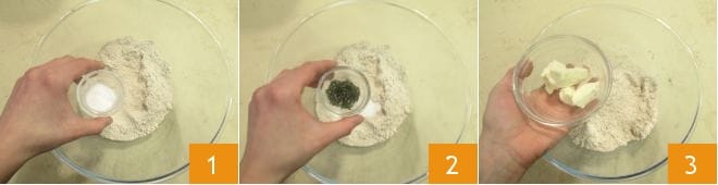 To prepare the spelt crackers, start by pouring the spelt flour into a large bowl, add the fine salt 1 and fresh thyme leaves 2 and mix well. Add the butter 3