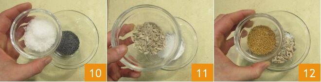 At this point, combine the poppy seeds, coarse salt (if you prefer, you can omit it or reduce the quantity) 10, sunflower seeds 11, and flax seeds 12 in a small bowl and mix with a teaspoon.