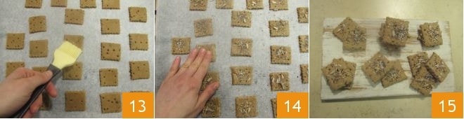 Transfer the dough squares to a baking sheet lined with parchment paper and brush them with a little water 13, then sprinkle the surface with the seed and coarse salt mix, pressing gently with your hands to make it adhere 14. Bake in a preheated static oven at 340°F for about 25 minutes, on the middle shelf of the oven. Once cooked, let them cool, then your spelt crackers will be ready to be crunched 15!