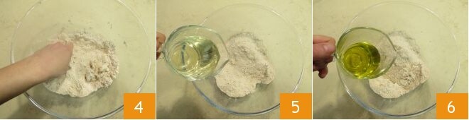 and blend it into the flour mixture by crumbling it with your hands 4, then pour in the white wine 5 and olive oil 6 and continue to work the mixture with your hands.