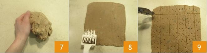 Once the dough is nice and compact, transfer it to a lightly floured work surface 7 and roll it out with a rolling pin until you get a sheet measuring 11x9 inches with a thickness of about 3/16 inch. Prick the dough with a dough docker 8 or otherwise with the prongs of a fork, then cut it into squares about 1.5 inches on each side using a fluted edge pastry wheel 9: you should get about 38 crackers in total.
