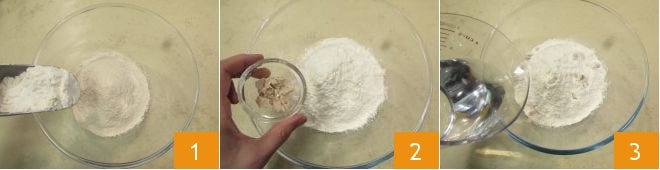 To prepare the spelt focaccia, first pour the 2 flours into a bowl 1; add the crumbled yeast 2 and about half of the water 3.