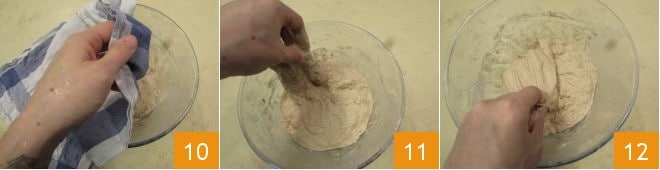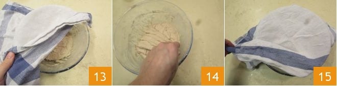 Cover again 13 and wait another 10 minutes before giving more folds 14. Cover again with the cloth 15 and repeat this operation 4 more times. At first, the dough will be sticky, but with each fold, it will become more tenacious.