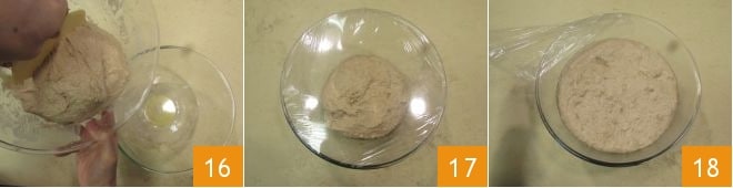 After the last 10 minutes, pour the dough into a lightly oiled bowl 16 and cover with plastic wrap 17. Place in the refrigerator and let it mature overnight. The next day, remove the dough from the fridge and let it sit at room temperature for at least an hour. Then remove the plastic wrap 18