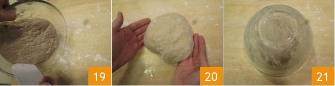 and transfer it to a lightly floured surface 19. Shape the dough into a ball 20 and cover it with a bowl 21. Wait about another 20 minutes.