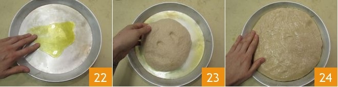 Grease a 13-inch diameter aluminum pan 22 and transfer the dough inside 23. Stretch the dough with your hands to cover the entire surface of the pan 24. If it retracts, let it rest for another 10 minutes.
