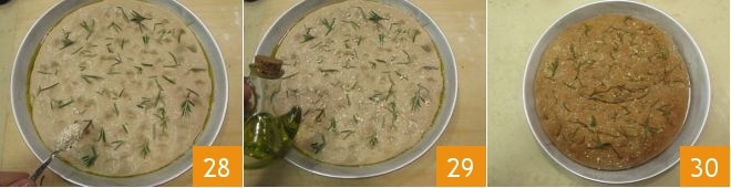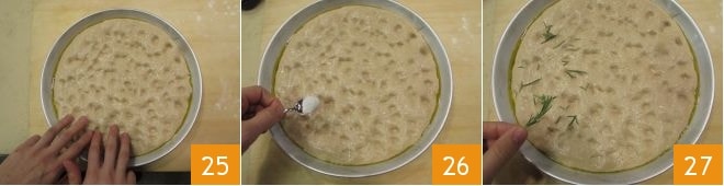 Using your fingertips, dimple the surface of the focaccia 25. Season it with coarse salt 26 and rosemary needles 27.