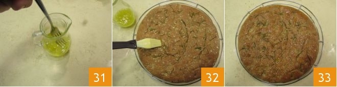 Quickly prepare a water and oil emulsion by pouring them into a small bowl and mixing them 31. Transfer the focaccia to a wire rack and brush it with the emulsion while it's still hot 32. Let it cool slightly before serving your fragrant spelt focaccia 33!