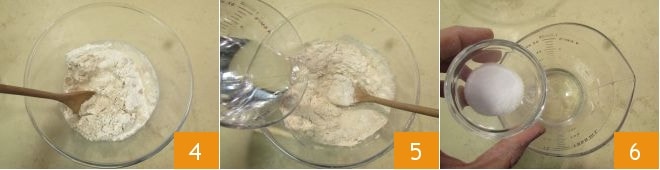 Mix with your hands or a wooden spoon 4, then add a little more water 5. Pour the salt into the remaining water 6