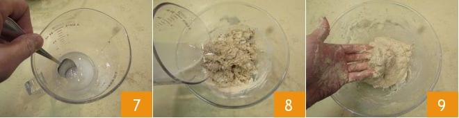 and stir with a teaspoon to dissolve it 7. Then pour the liquid into the dough 8 and work it with your hands until it is completely absorbed 9.