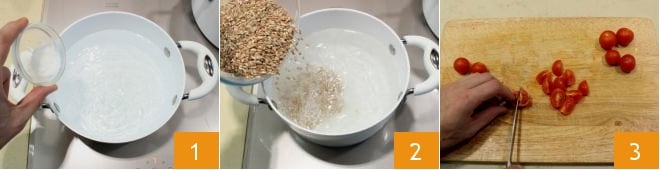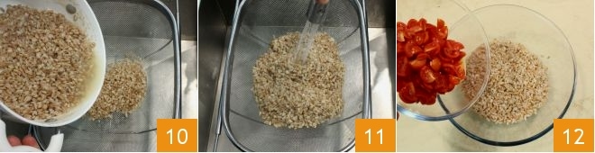 When the spelt is cooked, drain it and rinse it quickly under cold running water (10-11). Then place it in a bowl and add the cherry tomatoes 12