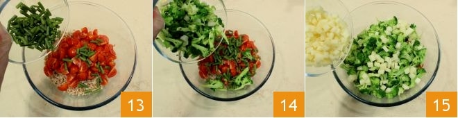 also add the drained and cooled vegetables: the green beans cut into pieces 13 and the florets 14. Then also add the cubed provolone 15.