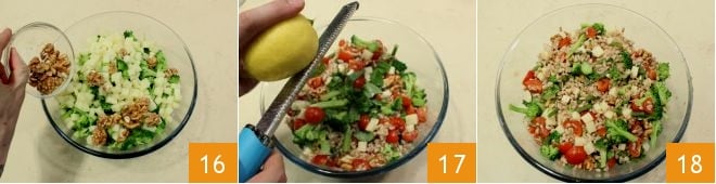 and the walnuts coarsely chopped 16. Grate the zest of 1 untreated lemon 17 and some fresh basil. If you like, you can also add a drizzle of oil and mix everything. Your spelt salad with vegetables is ready to be enjoyed 18!