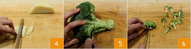 Then cut the provolone into cubes 4; wash and separate the florets from the main broccoli stalk 5 and cut them in half 6.