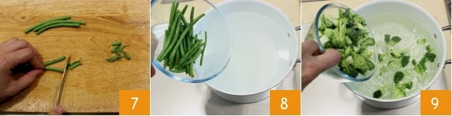 Trim the green beans 7 then blanch them in a pot 8 and do the same with the broccoli florets in a separate pot 9. A few minutes will suffice as the vegetables should remain crunchy.