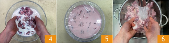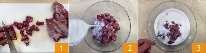 To prepare the wild boar stew with buckwheat polenta, first cut the wild boar meat into chunks of about 1 inch (3 cm) 1. Transfer them to a bowl, pour in the milk 2, and add the baking soda 3; make sure the meat is completely covered by the liquid.