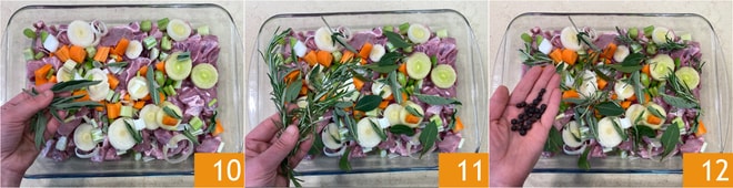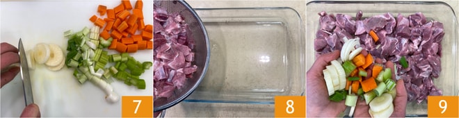 Set the meat aside in a colander and prepare the second marinade: clean and roughly chop the carrot, celery, green onion, and leek 7. Transfer the wild boar meat to a wide and shallow container 8, then distribute the vegetables on top 9.