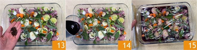 Add the cloves 13 as well, then pour in the red wine 14 and cover with plastic wrap 15. Marinate in the refrigerator for another 24 hours.