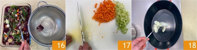 After this time, prepare the vegetable broth and keep it warm. Then take the meat out of the marinade, let it drain in a sieve 16, and discard the vegetables. Clean and dice the carrot and celery, then thinly slice the green onion 17. In a cast-iron pot, gently melt the lard with the butter 18.