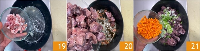 Add the chopped pancetta 19 and briefly fry over high heat, then add the wild boar meat 20 and brown it well for a few minutes. At this point, add the vegetables 21.