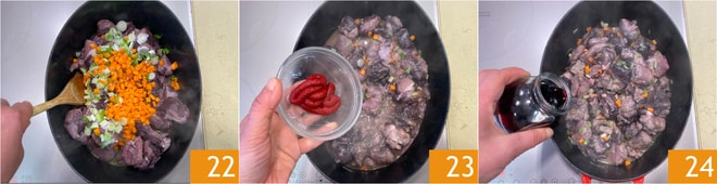Sauté for a couple of minutes 22, then season with the tomato paste 23 and stir to combine. Deglaze with the red wine 24 and let the alcohol evaporate completely.
