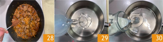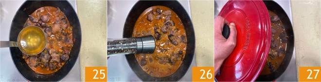 Cover with the vegetable broth 25, season with salt and pepper 26, cover with the lid 27, and cook over low heat for 2 and a half hours.