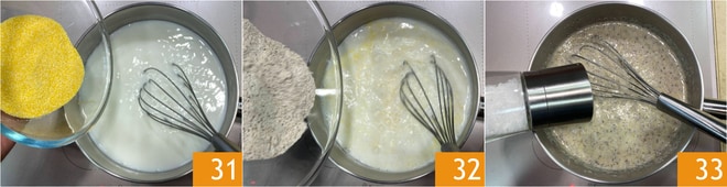 At the end of cooking, turn off the heat and finish with the unsweetened cocoa 28, stirring well to combine. For the buckwheat polenta, pour the water 29 and milk 30 into a saucepan, then bring to a boil.