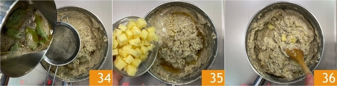 Once cooked, turn off the heat and stir in the flavored melted butter 34 and the cubed cheese 35. Mix well to melt the cheese and achieve a smooth consistency 36.