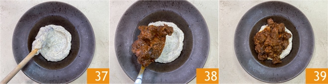 You're ready to plate: distribute the polenta on the plate 37 and place the meat chunks on top 38. Your wild boar stew with buckwheat polenta is ready to be served 39!