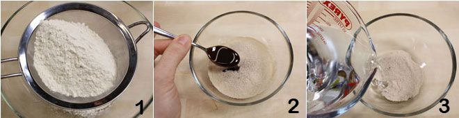 To prepare the Romagna flatbread, start by sifting the two flours into a large bowl 1. Place the yeast in a small bowl and add a teaspoon of malt (or sugar) 2 and a little water (taken from the total amount in the recipe), then mix until the yeast is completely dissolved 3.